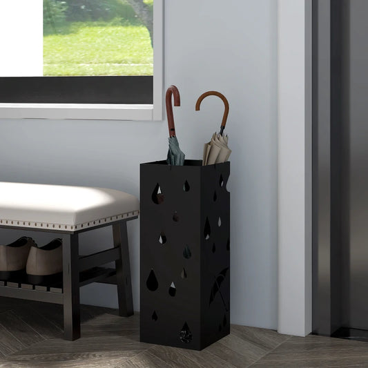 HOMCOM Heavy Duty Square Umbrella Basket w/ 4 Hooks & Drip Tray | Black, Metal