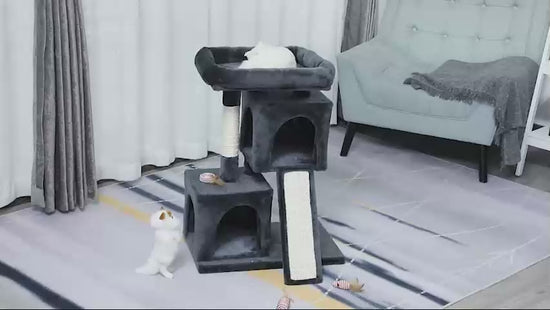 - Features two large houses, several sisal scratching posts and a large top cushioned perch